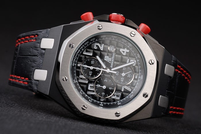 Bracelet en acier inoxydable: Heat gaufré Audemars Piguet crocodile noir bracelet en cuir avec double couture rouge et Audemars Piguet ion plaqué gravé fois en clasp