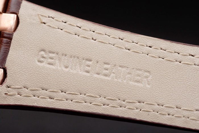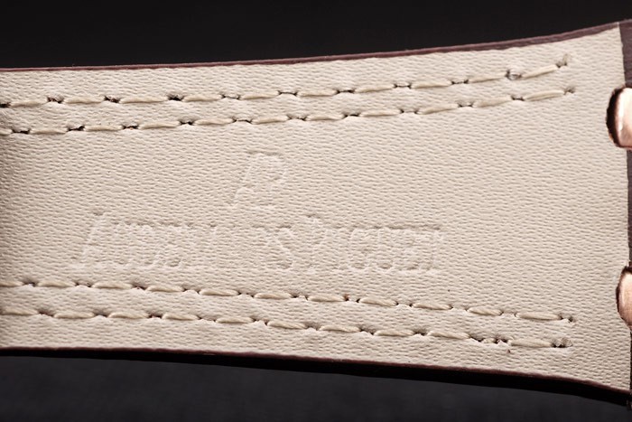 Bracelet: Heat gaufré Audemars Piguet sombre bracelet en cuir de crocodile brun avec double couture blanc et Audemars Piguet gravé plaqué or rose fold-in clasp