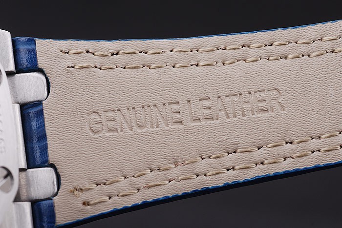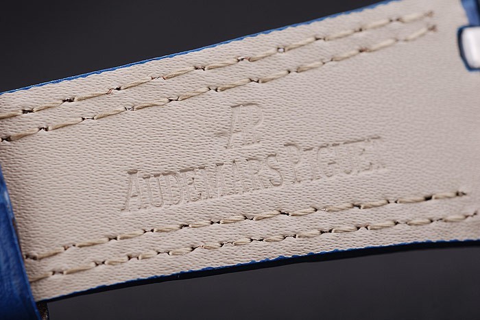 Bracelet: bleu bracelet en cuir de crocodile avec double couture blanche et la chaleur en relief nom Audemars Piguet et le logo et une Audemars Piguet inscrit en acier inoxydable flip-dessus le crochet clasp