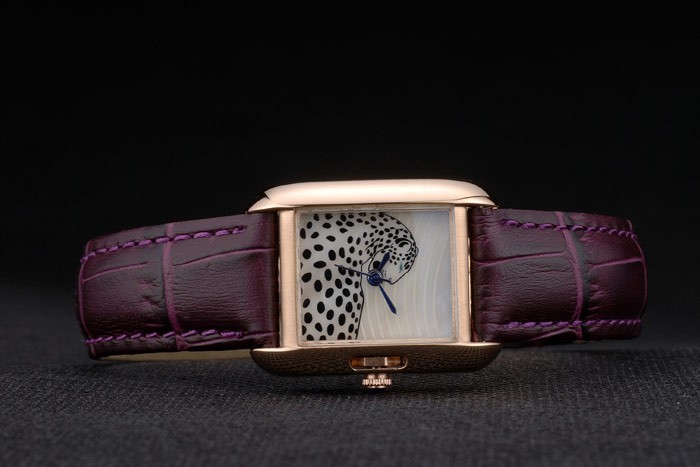 Cette réplique Cartier Luxe 80198 est pourvue d’un retour vissé en acier inoxydable brossé, d’un mouvement à quartz japonais Miyota, d’un boîtier en acier inoxydable plaqué or rose 18 carats, d’un bracelet en cuir violet embossé en crocodile Cartier à l’effigie de la marque, d’une boucle déployante plaquée or rose 18 carats, d’une lunette plaquée or rose 18 carats avec couronne incrustée, d’un verre saphir et une couronne sertie d’un saphir bleu de 18 carats. Elle convient aux femmes et mesure 30 x 23 mm. Le boîtier a une épaisseur de 8 mm et la longueur du bracelet est de 185 x 16 mm.