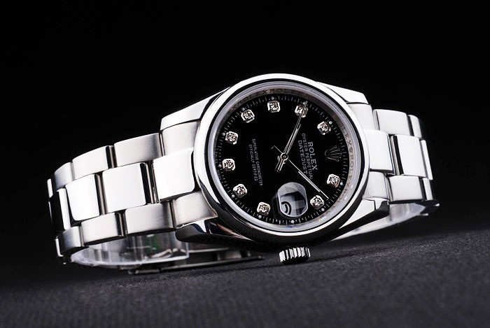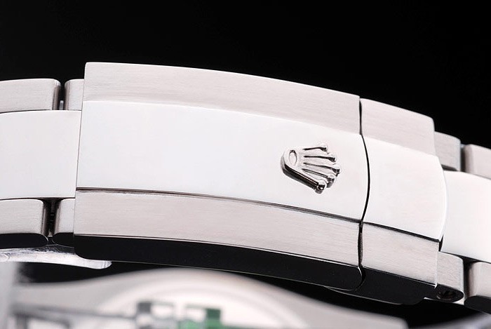 Bracelet: brossé et poli bracelet en acier inoxydable avec gravure Rolex pliez en boucle déployante affichant la longueur Rolex logo