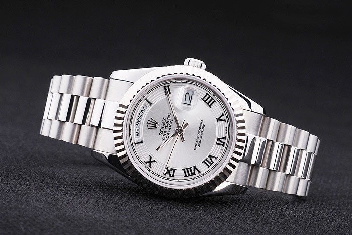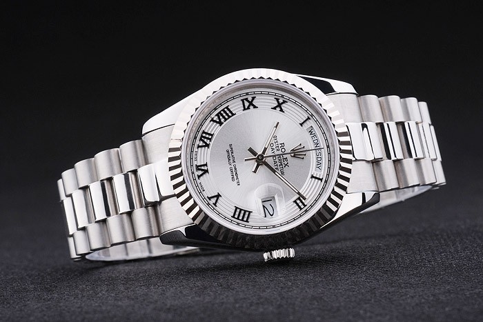 Une réplique de qualité supérieure de la montre Rolex Day-Date 4818. Le boîtier en acier inoxydable brossé est équipé d’un bracelet en acier inoxydable brossé et poli gravé du logo Rolex. Le verre saphir et la couronne en acier inoxydable poli gravée du logo Rolex complètent le look.