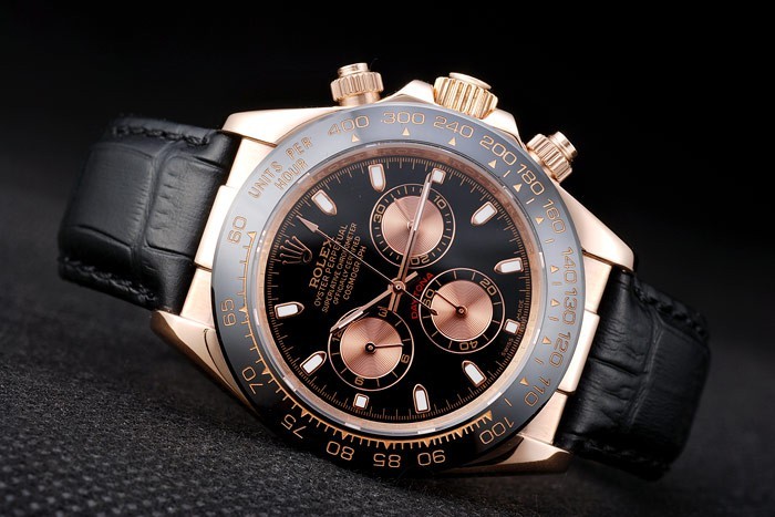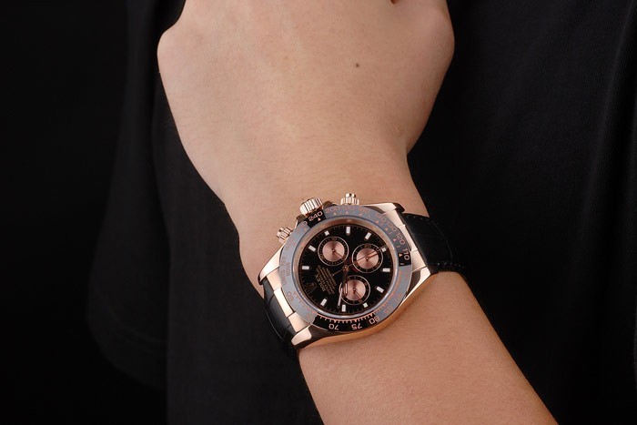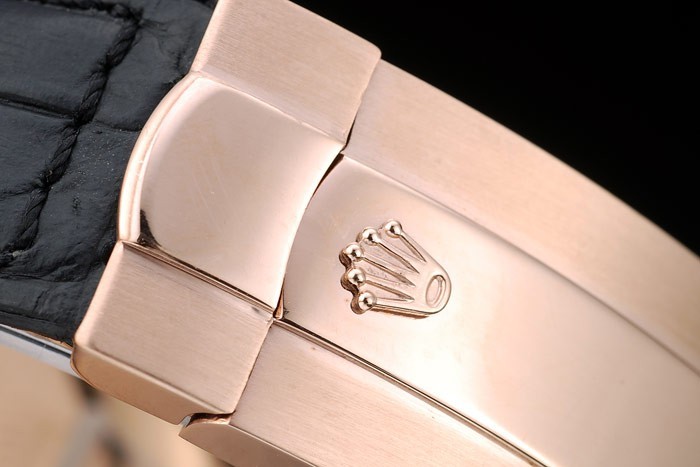 Bracelet: estampé crocodile noir bracelet en cuir de chaleur Rolex gravée en or rose boucle déployante avec Rolex logo sur top