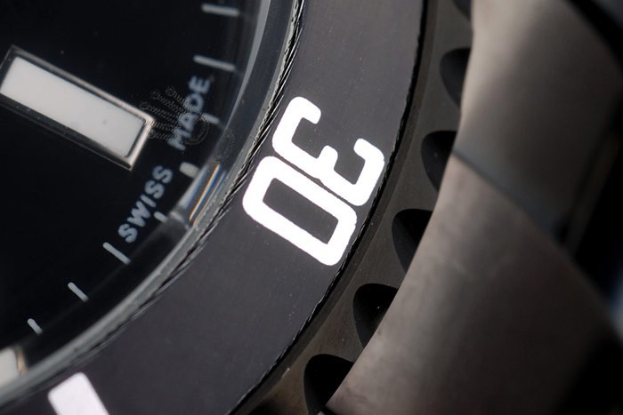 Bezel: Noir émaillé cutwork lunette avec index et chiffres arabes minute markers